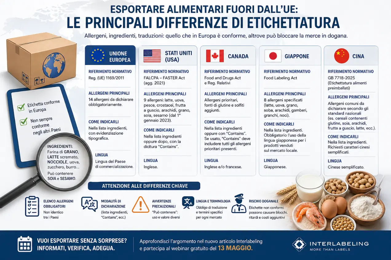 Il tema sarà al centro del webinar gratuito del 13 maggio: un primo orientamento pratico per le aziende alimentari che vogliono esportare evitando blocchi doganali, rilavorazioni grafiche e rischi di non conformità.